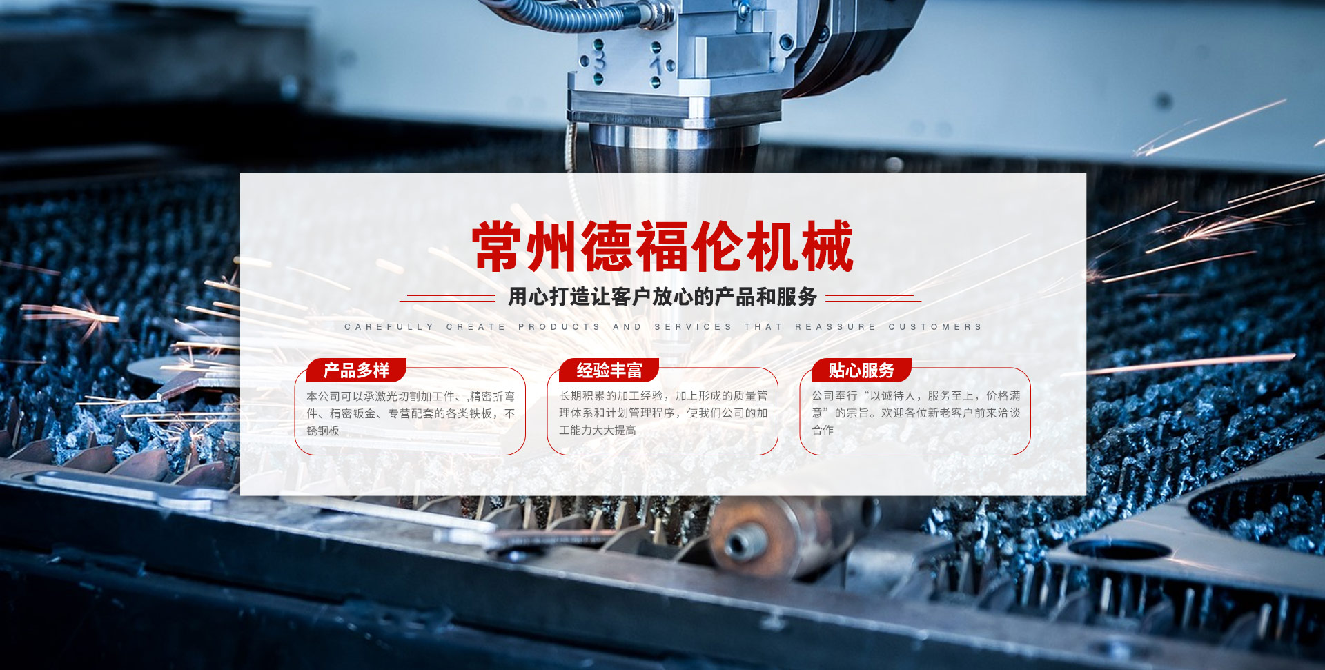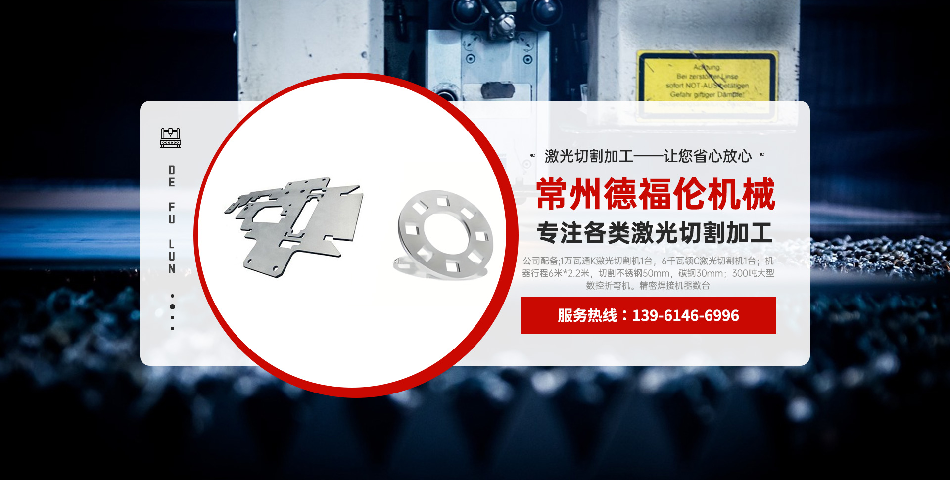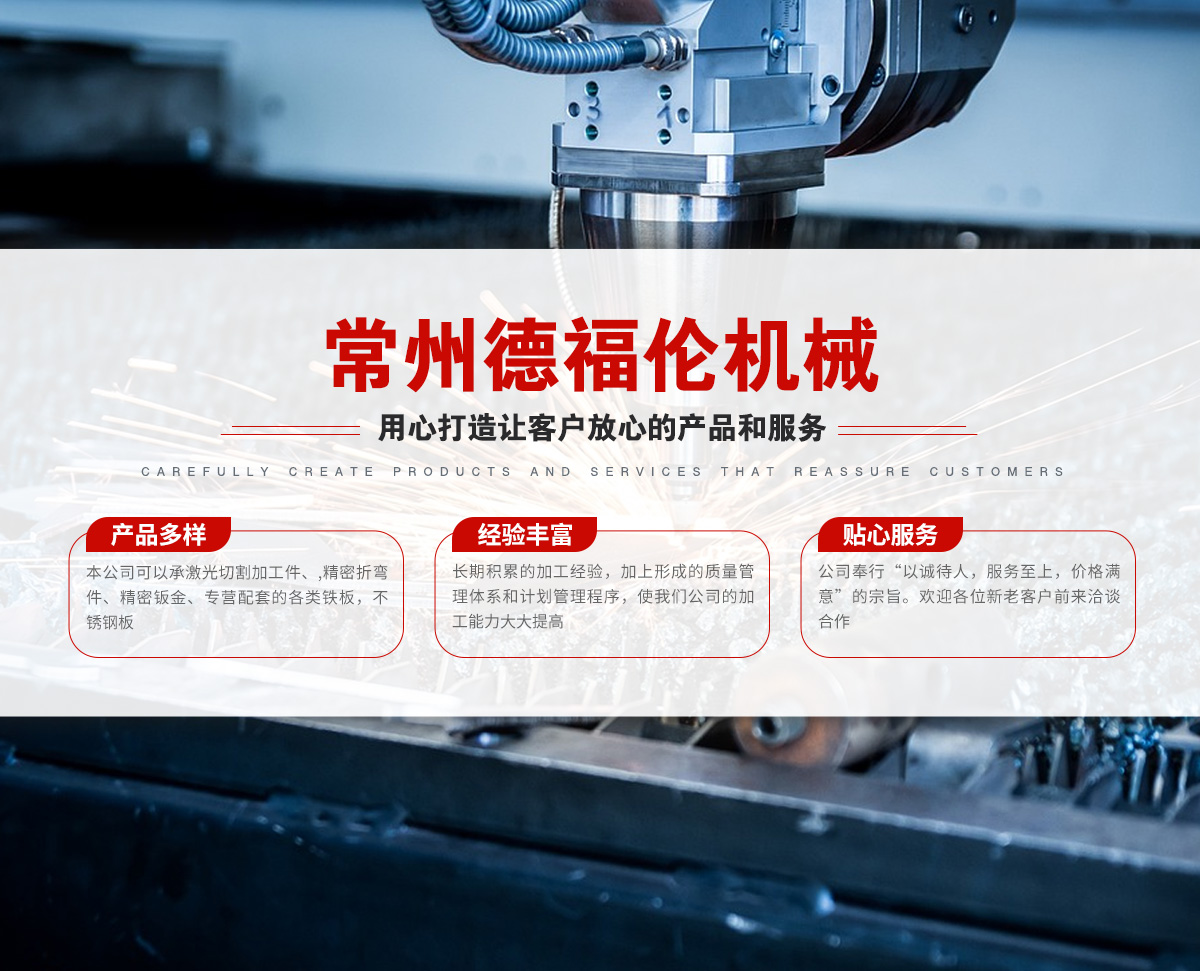 常州德福倫機(jī)械有限公司成立于2014年12月19號,位于江蘇省常州市武進(jìn)區(qū)遙觀鎮(zhèn)建農(nóng)村劍童路56號西門;公司配備;1萬瓦通K激光切割機(jī)1臺,6千瓦領(lǐng)C激光切割機(jī)1臺;機(jī)器行程6米*2.2米,切割不銹鋼50mm,碳鋼30mm;300噸大型數(shù)控折彎機(jī)。精密焊接機(jī)器數(shù)臺。本公司可以承激光切割加工件、,精密折彎件、精密鈑金、專營配套的各類鐵板,不銹鋼板。長期積累的加工經(jīng)驗(yàn),加上形成的質(zhì)量管理體系和計劃管理程序,使我們公司的加工能力大大提高,滿足客戶所需,是我們公司的目標(biāo)!公司奉行“以誠待人,服務(wù)為上,價格滿意”的宗旨。歡迎各位領(lǐng)導(dǎo);老總前來洽談合作!